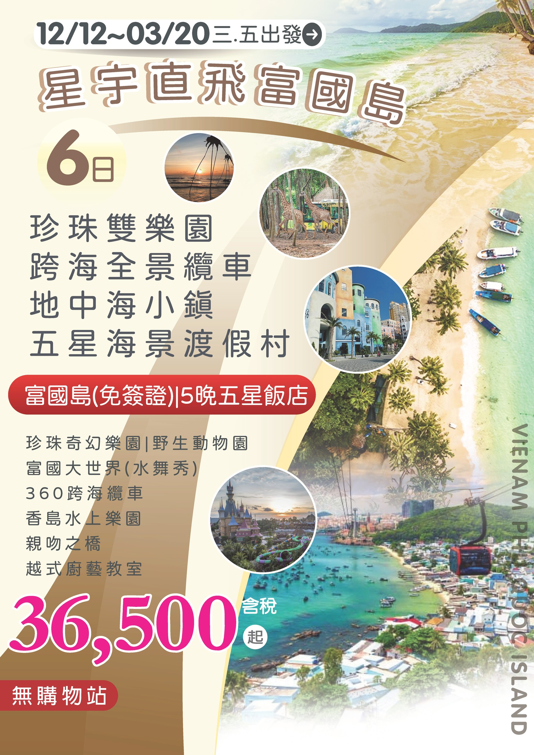 星宇直飛富國島~珍珠雙樂園、跨海全景纜車、地中海小鎮、五星海景渡假村6日