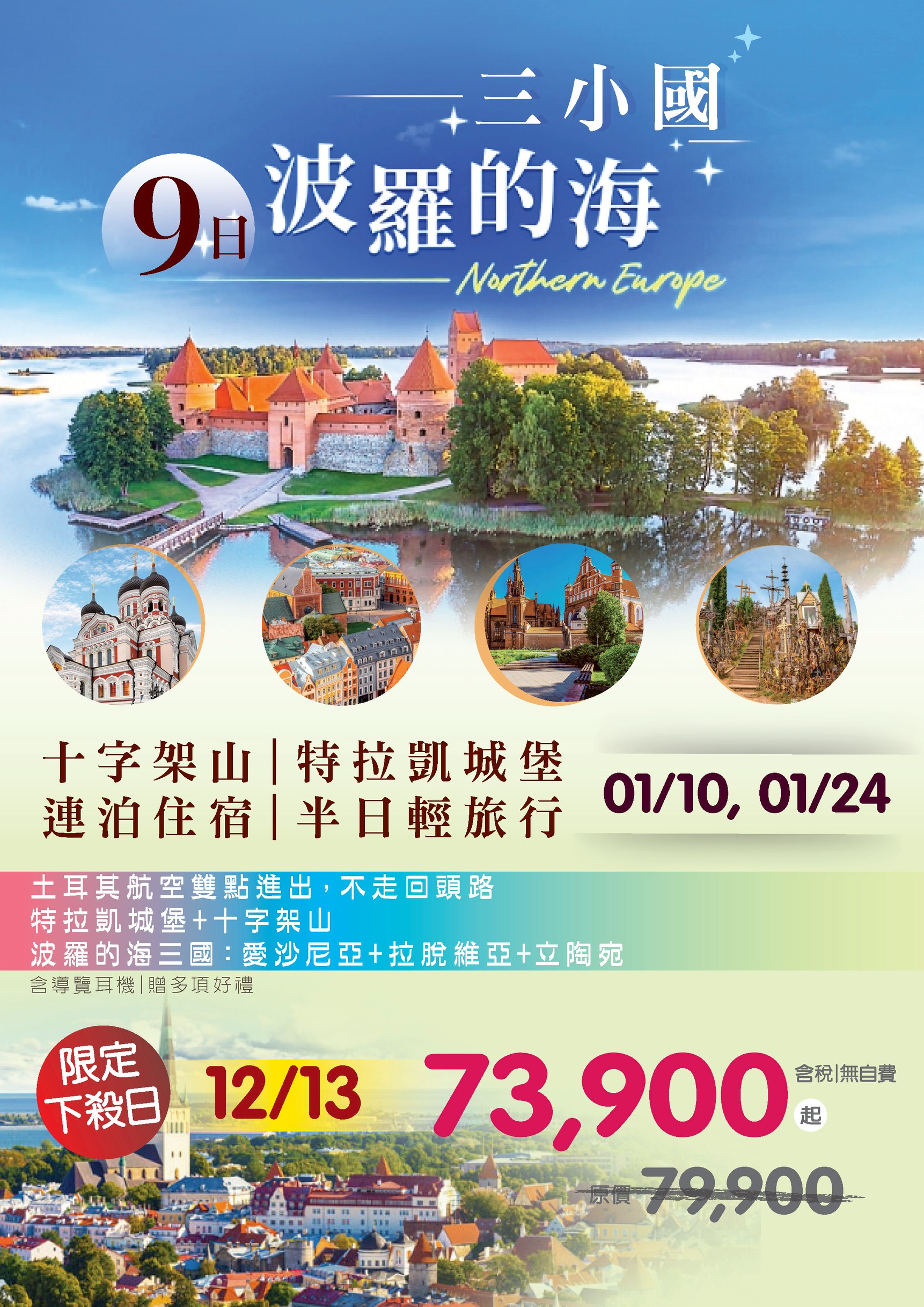 •  ◎ 主 題:系列團~12月13日波羅的海三小國~十字架山、特拉凱城堡、連泊住宿、半日輕旅行九日