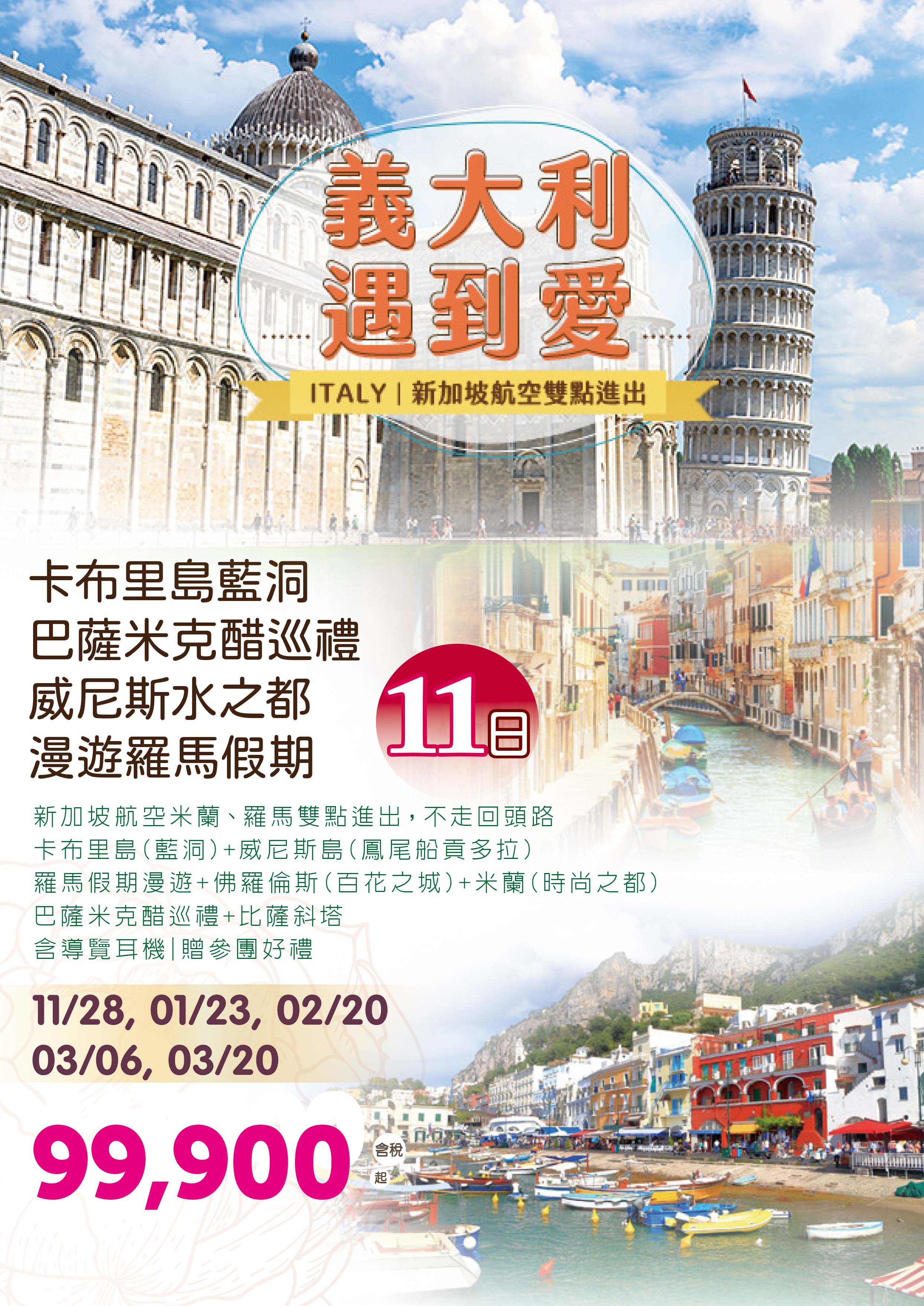 •  ◎ 主 題:11/28義大利遇到愛~卡布里島藍洞、巴薩米克醋巡禮、威尼斯水之都、漫遊羅馬假期11日
